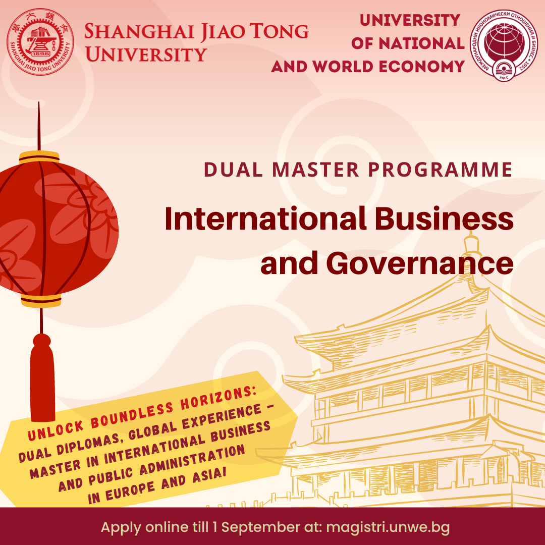 В дуалната магистърска програма „Международен бизнес и управление“ (“International Business and Governance”), предлагана от катедра „Международни икономически отношения и бизнес“, УНСС и Шанхайския университет „Джао Тонг“ (Китай) сe обучават бакалаври с образователно-квалификационна степен от различни професионални направления. Тя подготвя магистри със знания и практически умения в областта на международния бизнес и на публичните политики. Обучението е изцяло на английски език. През първите два семестъра то се осъществява в УНСС, а през третия и четвъртия семестър - в най-големия търговски, финансов и икономически център на Китай – Шанхай. В края на обучението си магистрите получават две дипломи за завършена магистърска степен с преподаване на английски език – по „Международен бизнес“ от УНСС и по „Публична администрация“ от Шанхайския университет „Джао Тонг“. Съгласно споразумението, подписано между двата университета, българските студенти заплашат първите два семестъра такси за обучение в УНСС, а третият и четвъртият семестър – таксите на Шанхайския университет „Джао Тонг“ (през 2023 г. годишната такса там е 70 000 юана). Студентите имат възможност да кандидатстват за китайска правителствена стипендия, която покрива разходите за такси за обучение, медицинска застраховка, общежитие. Ежегодно такъв конкурс се обявява от Министерството на образованието и науката на Република България по силата на Споразумението за сътрудничество в областта на образованието с Китайската народна република.