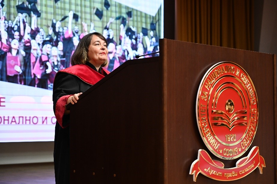 „Днес стоим на прага на нов етап от вашия живот – денят, в който завършвате обучението си в УНСС. Това не е просто край на един цикъл, а начало на ново пътешествие, изпълнено с предизвикателства, отговорности и възможности“, каза проф. Цветана Стоянова. Тя пожела на абсолвентите да бъдат лидери, които не само управляват, но и вдъхновяват. Да бъдат професионалисти, които не се страхуват от промяната, а я превръщат във възможност. Да бъдат хора, които вярват, че успехът има смисъл само когато е споделен.