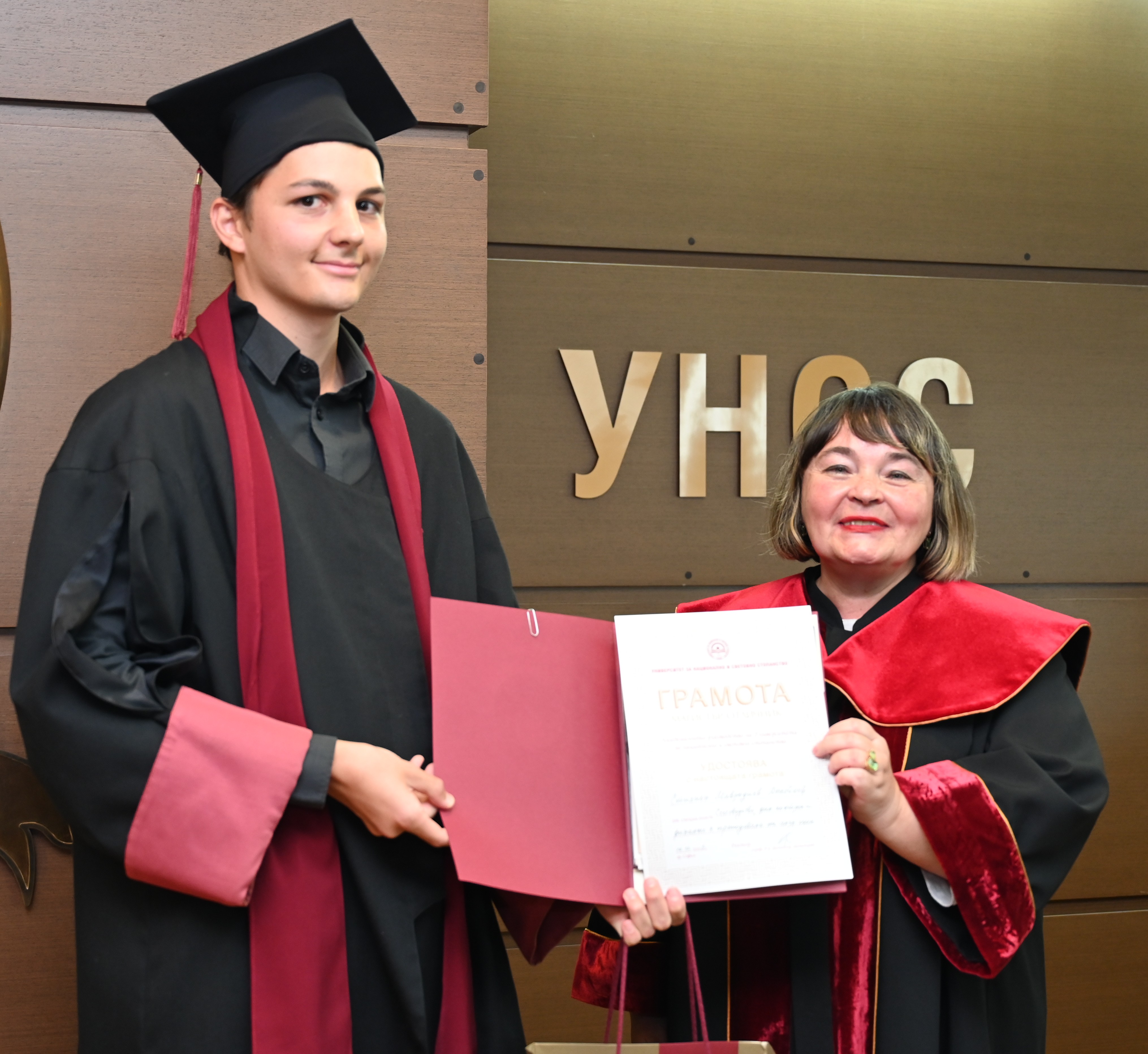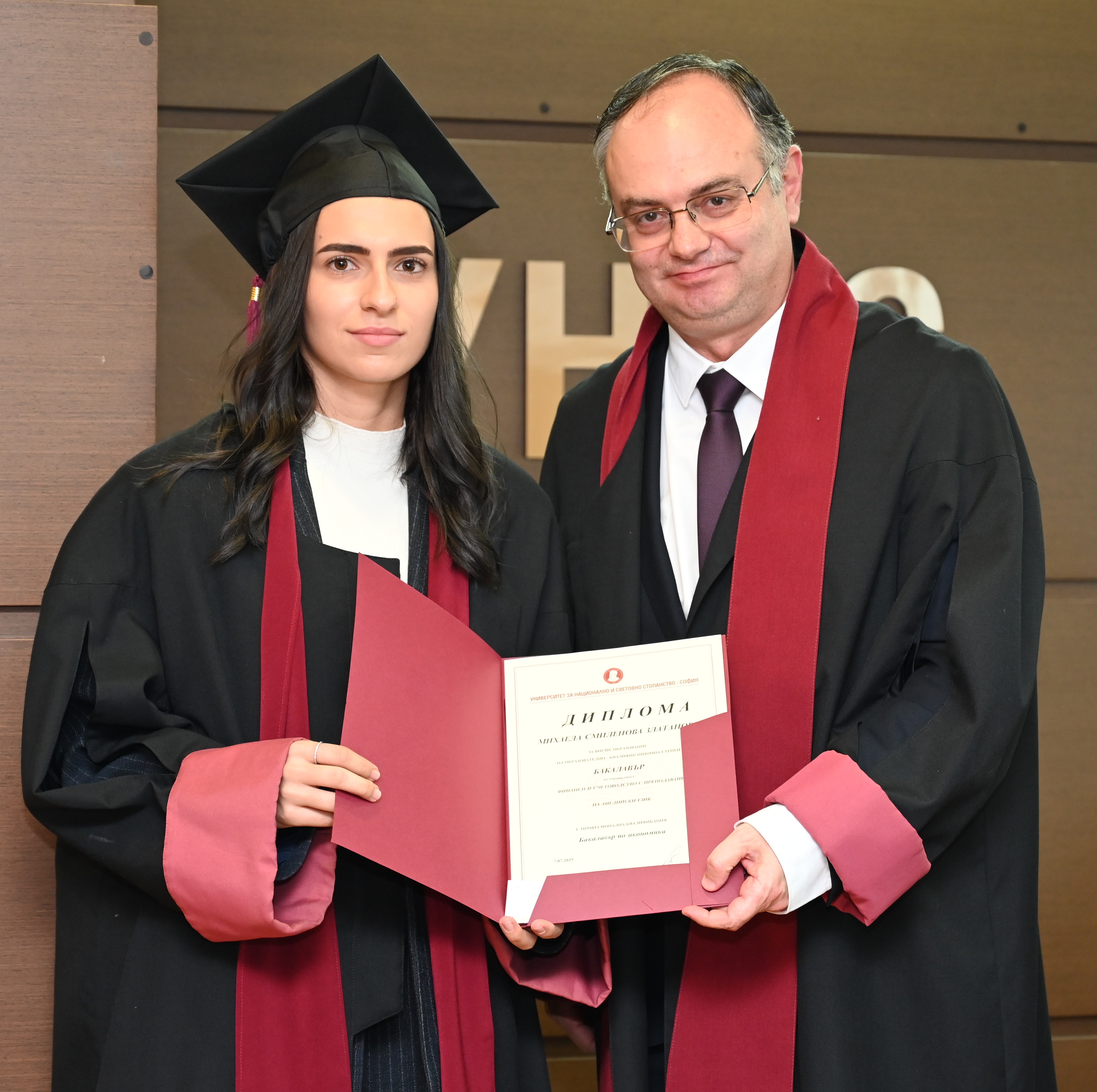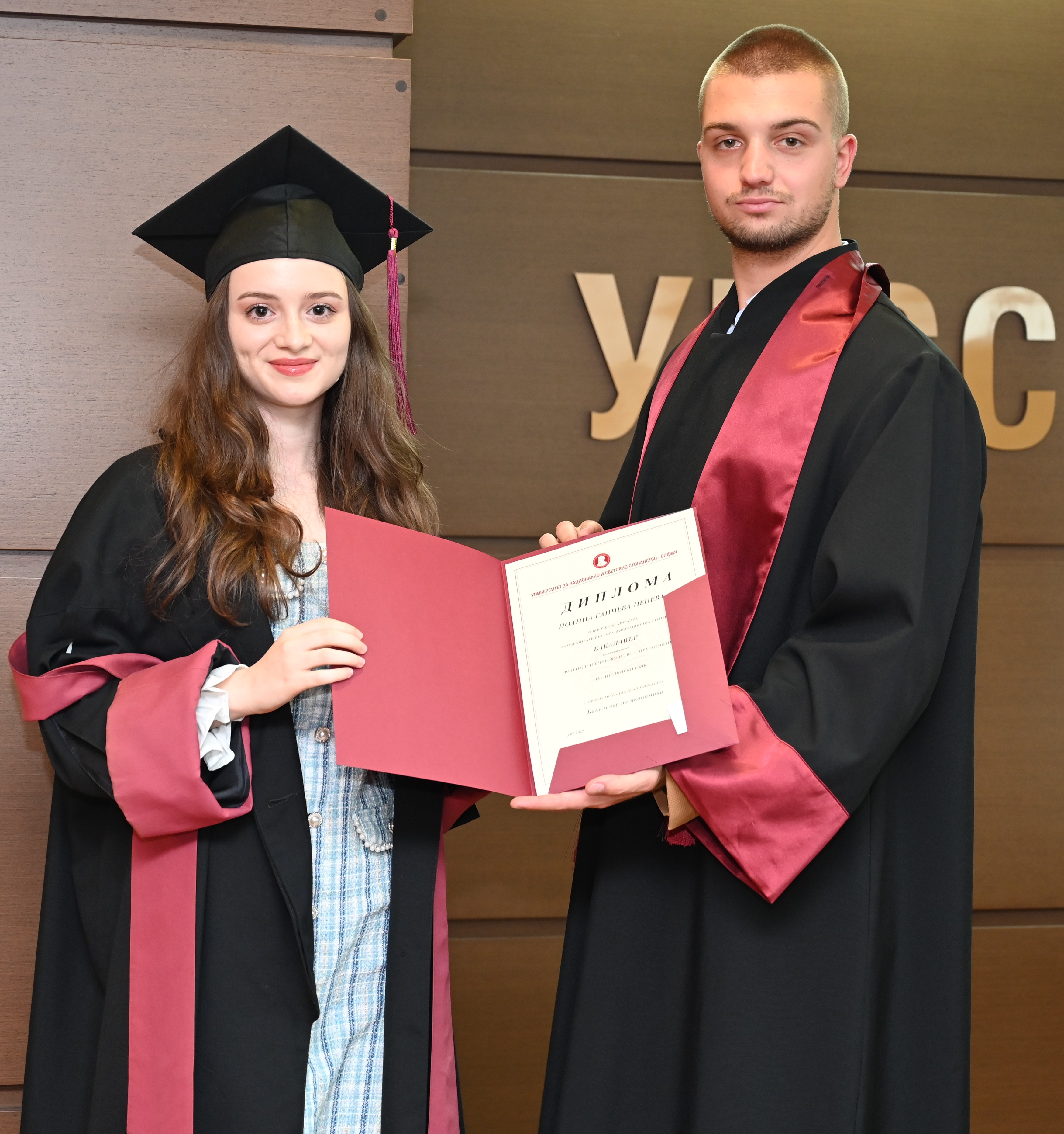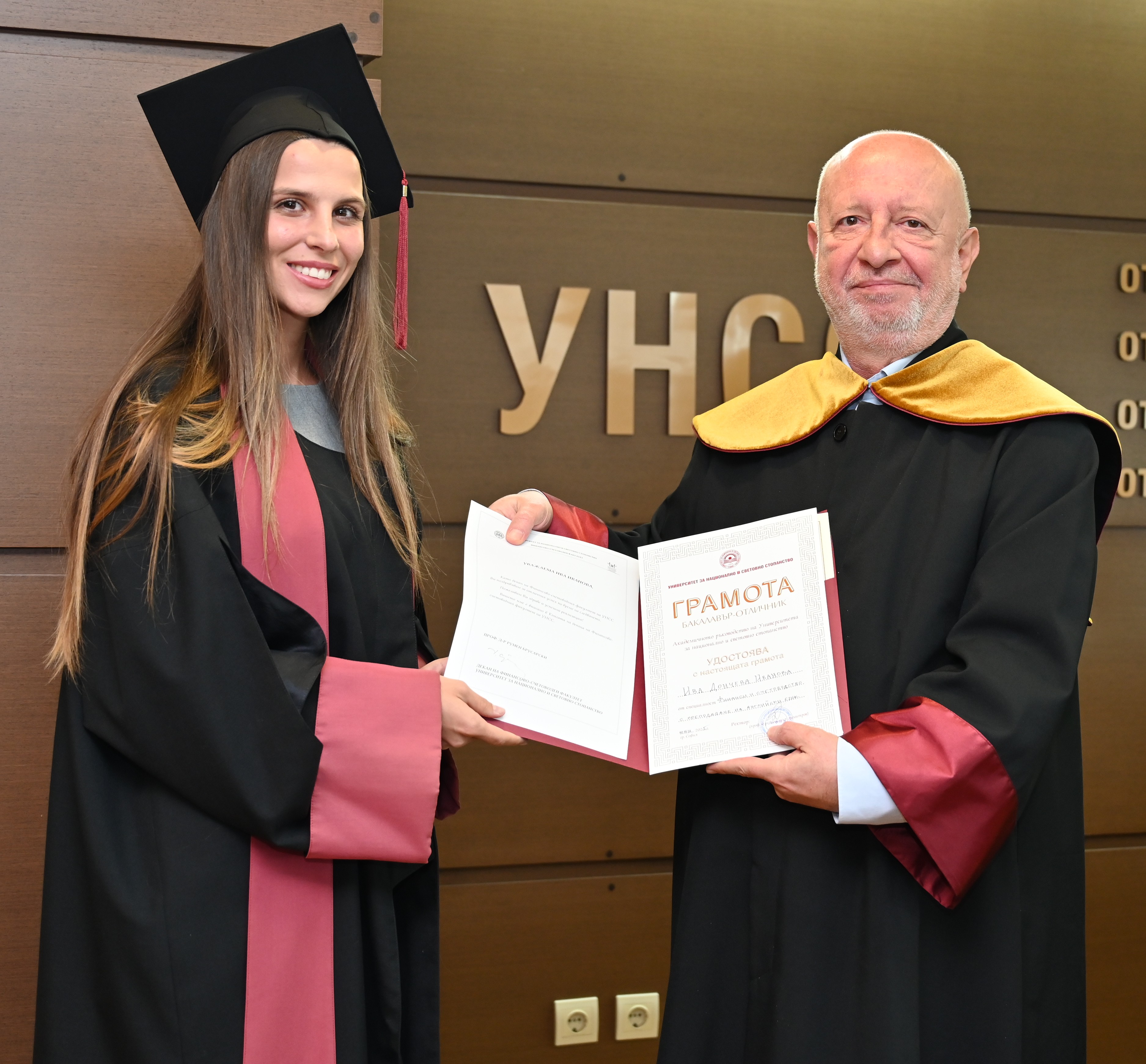 Председателят на Студентски съвет Калоян Стефанов пожела на завършващите да запазят вярата в себе си, да следват пътя си с увереност и да носят духа на УНСС.