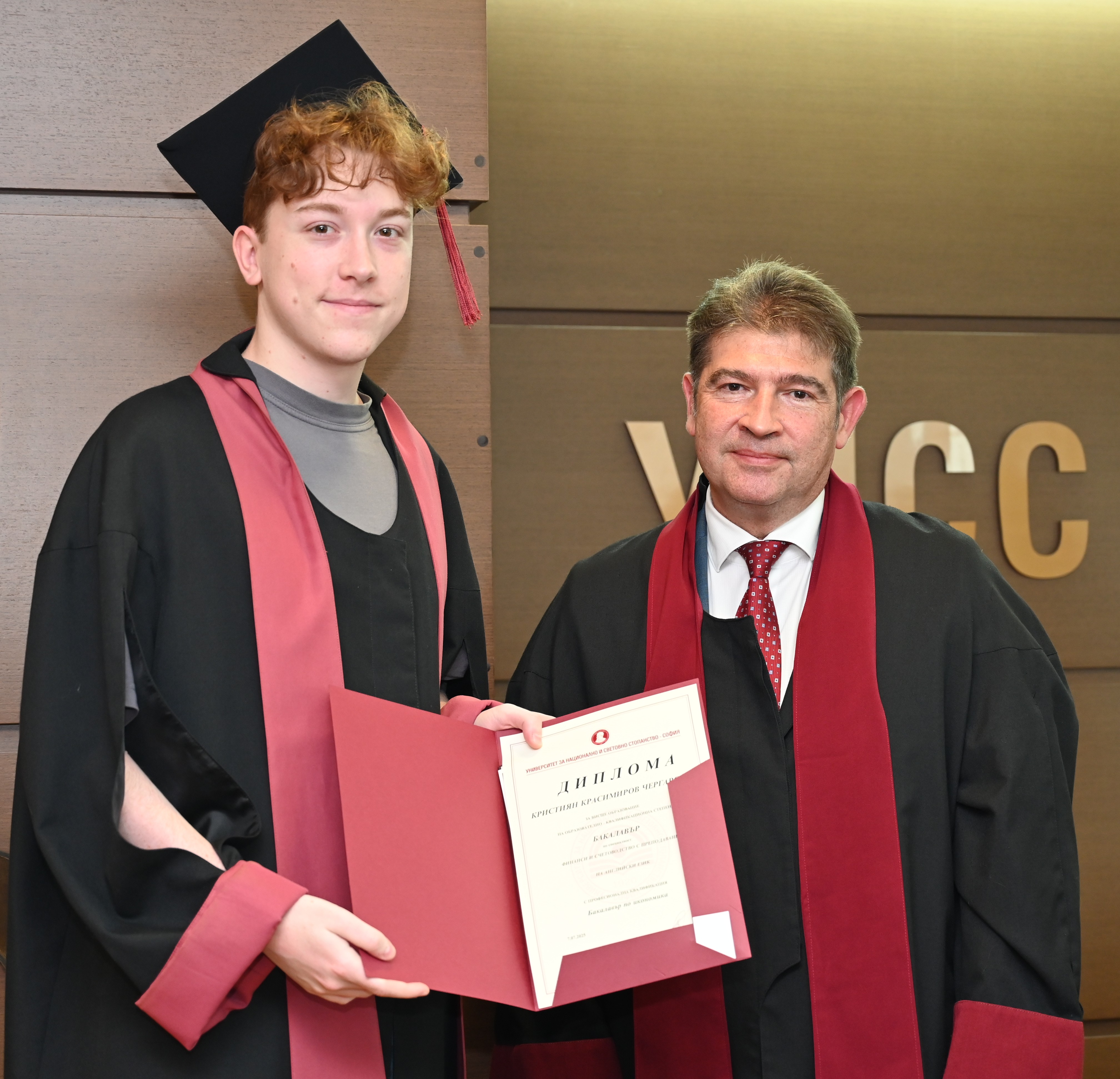 Проф. Александрова връчи първата диплома, която бе за пълния отличник на випуск 2025 – Стилиян Джойкев, който от своя страна благодари на преподавателите от името на своите колеги.