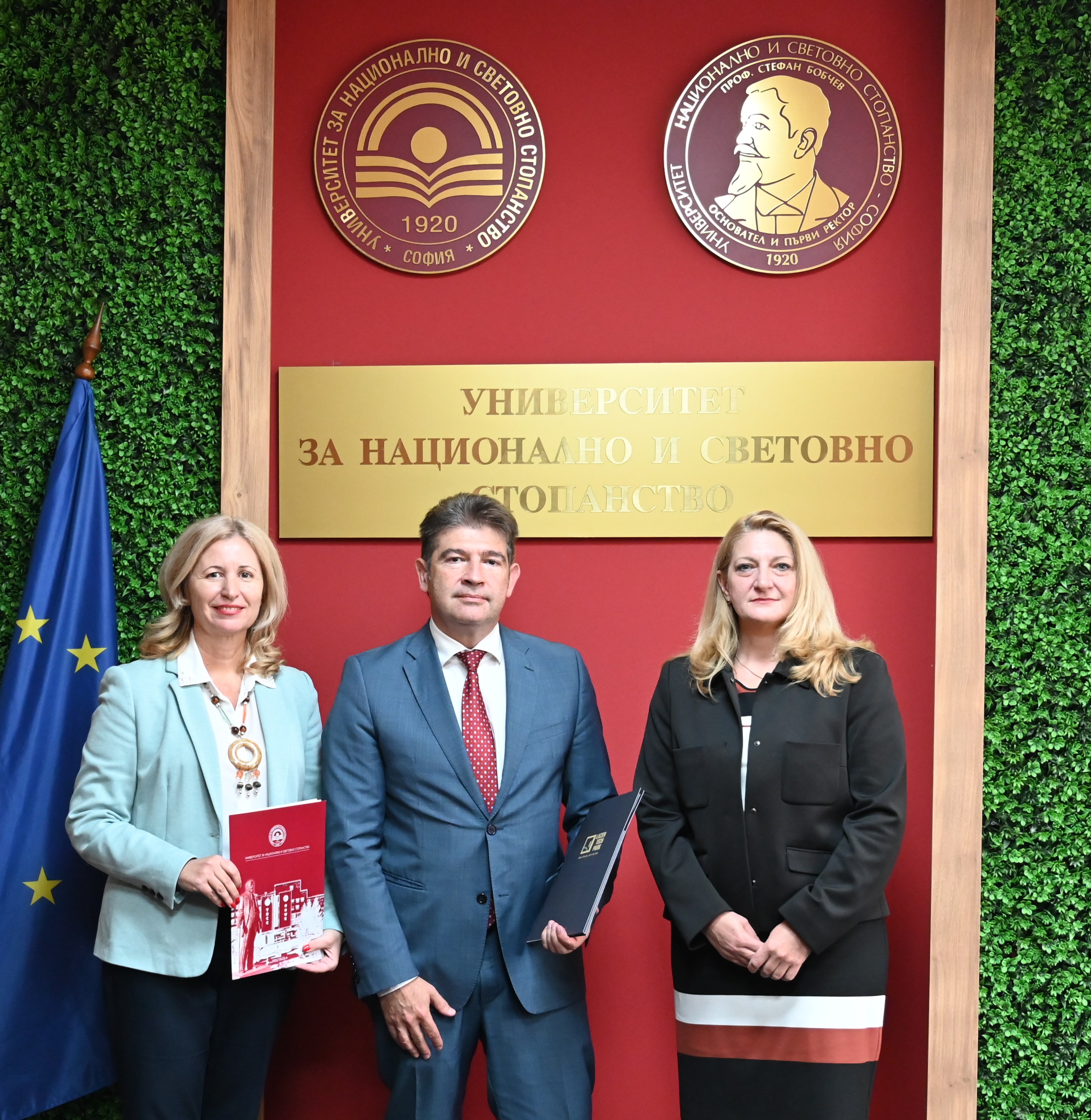 Доц. д-р Георги Ранчев, проф. д-р Цветана Стоянова, гл. ас. д-р Ина Лечева, координатор по реализацията на меморандума от страна на УНСС |