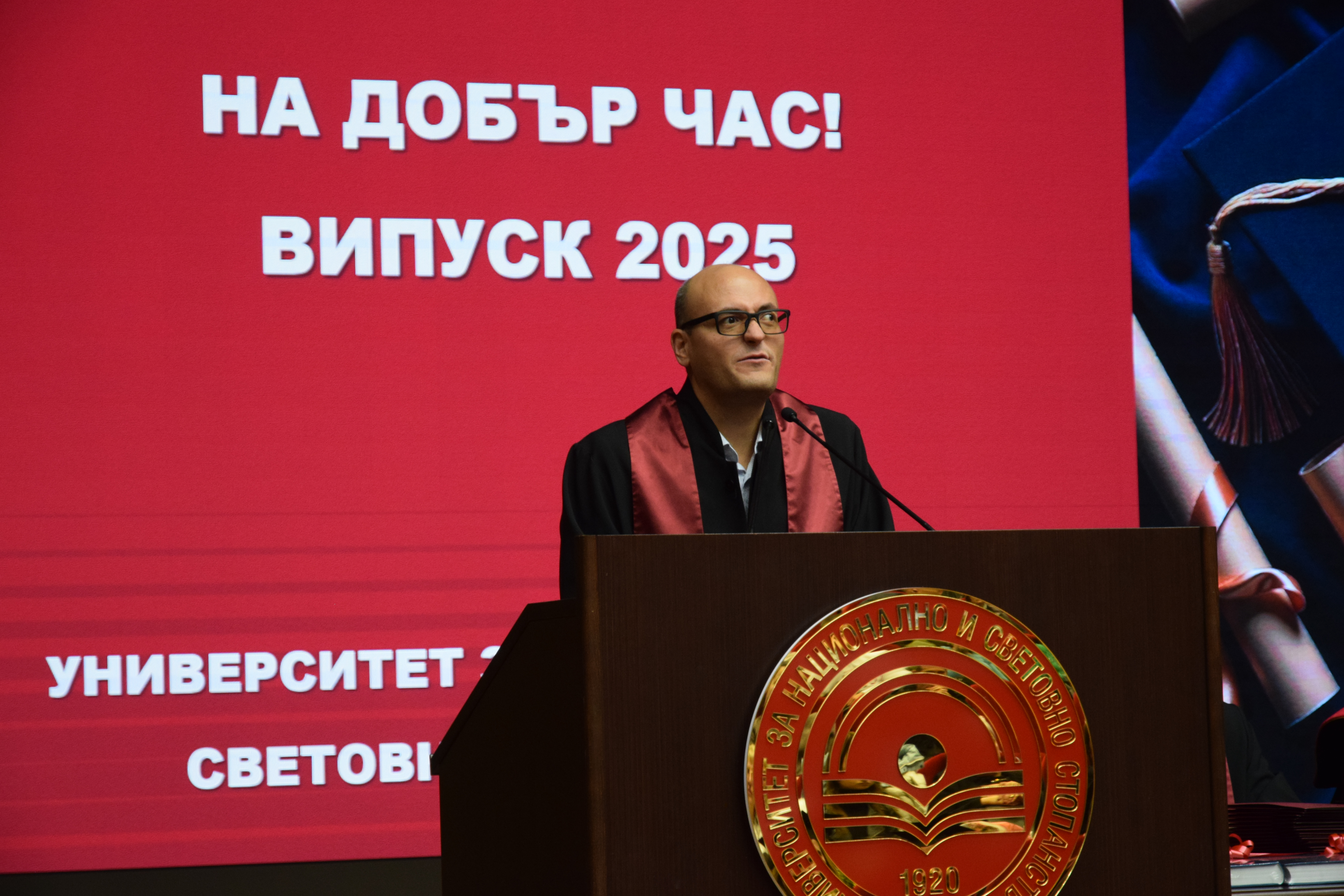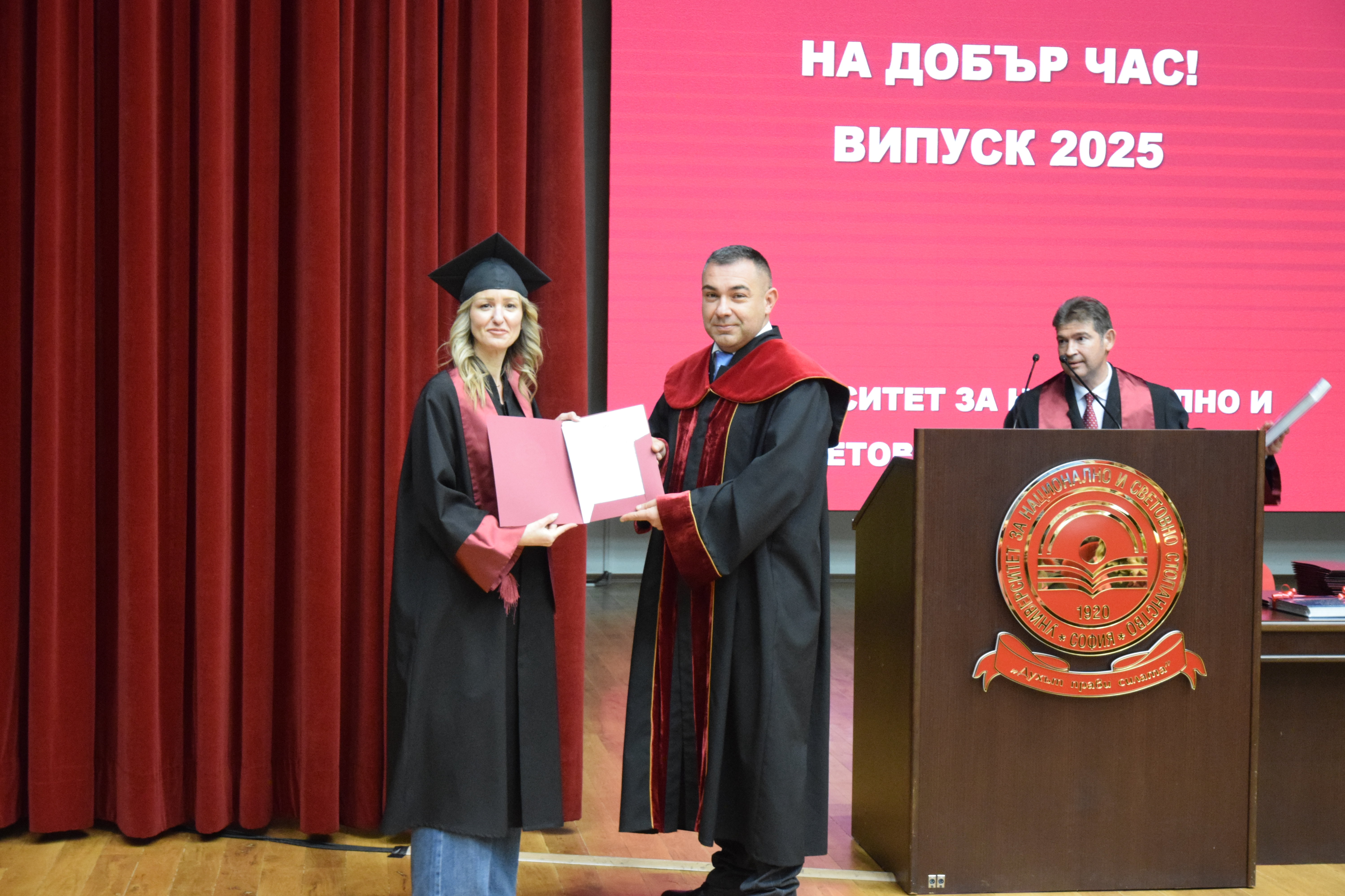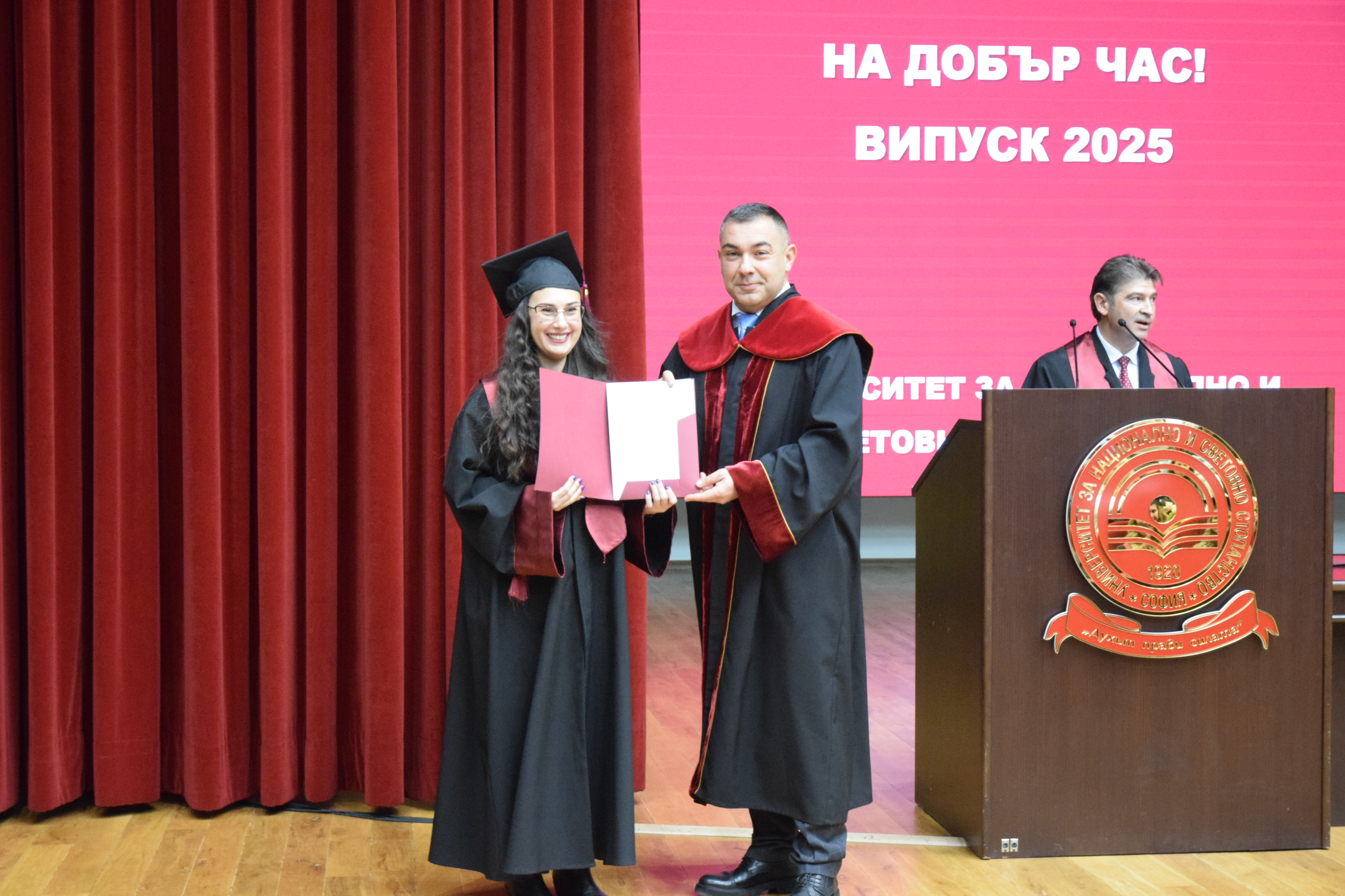 Абсолвентите бяха поздравени и от председателя на Студентския съвет – Калоян Стефанов, който пожела: „Носете в себе си духа на УНСС – дух на професионализъм, почтеност и стремеж към развитие. И нека всяко следващо стъпало бъде ваше собствено доказателство, че сте готови за предизвикателствата на бъдещето“.