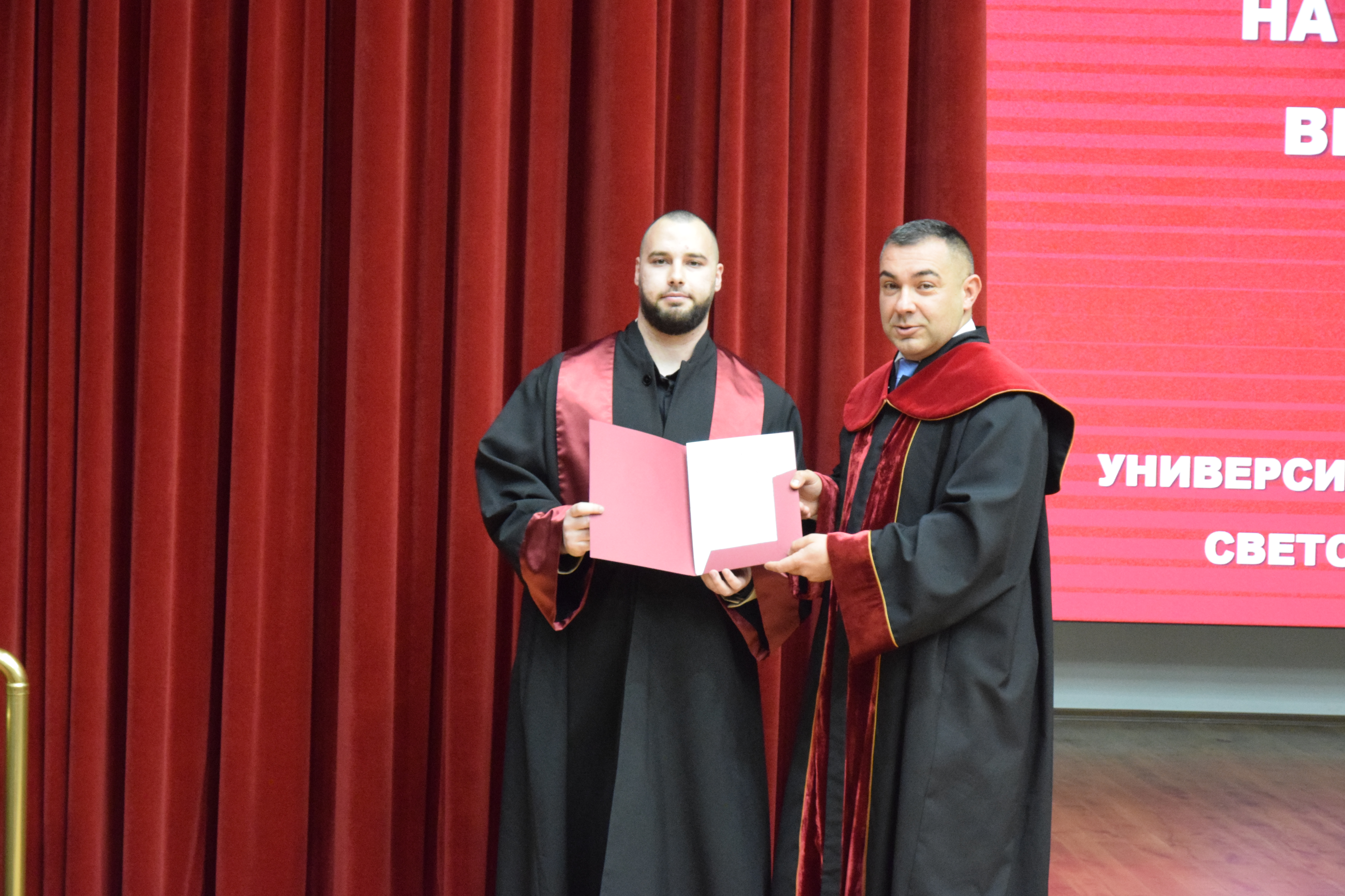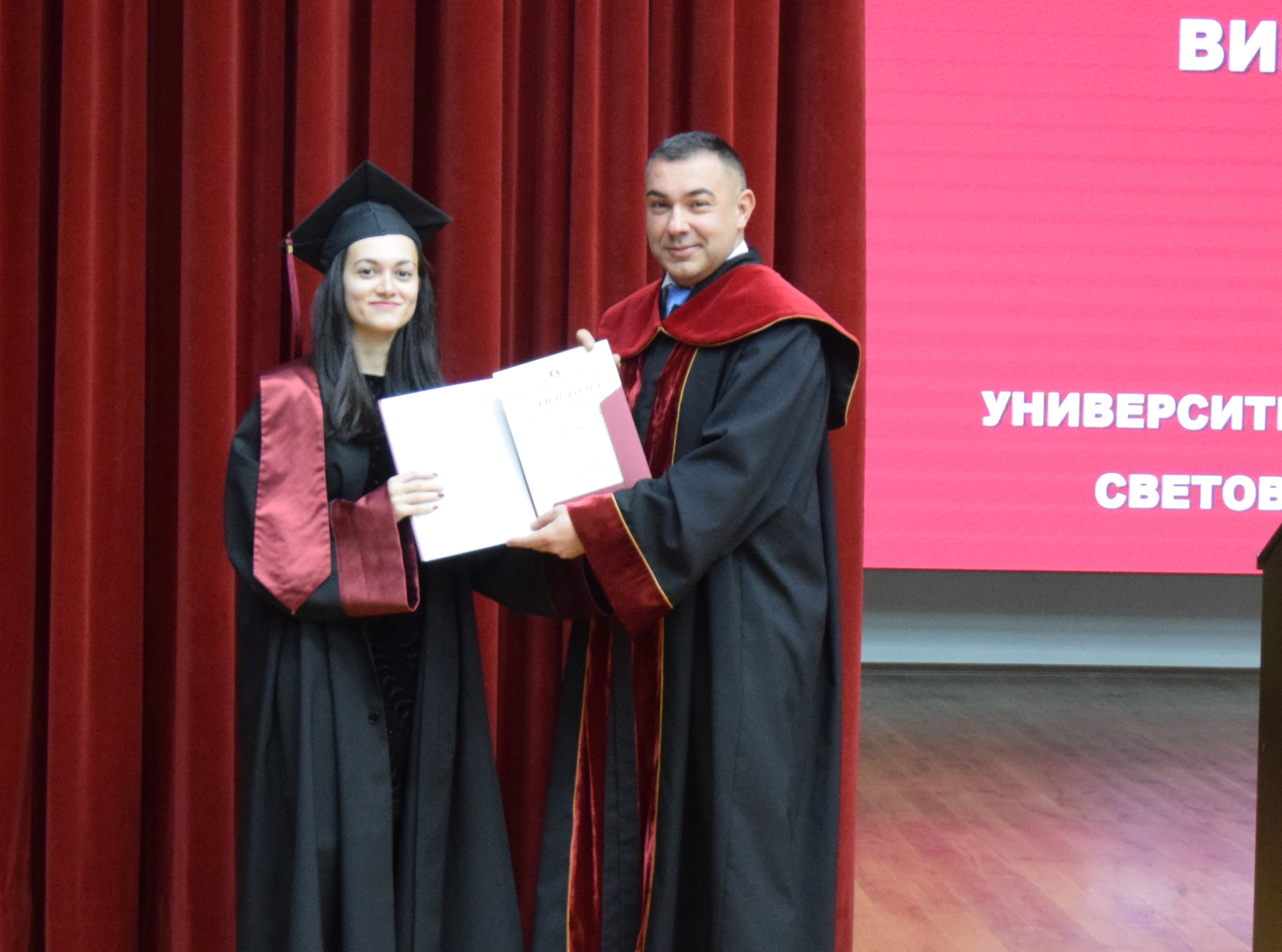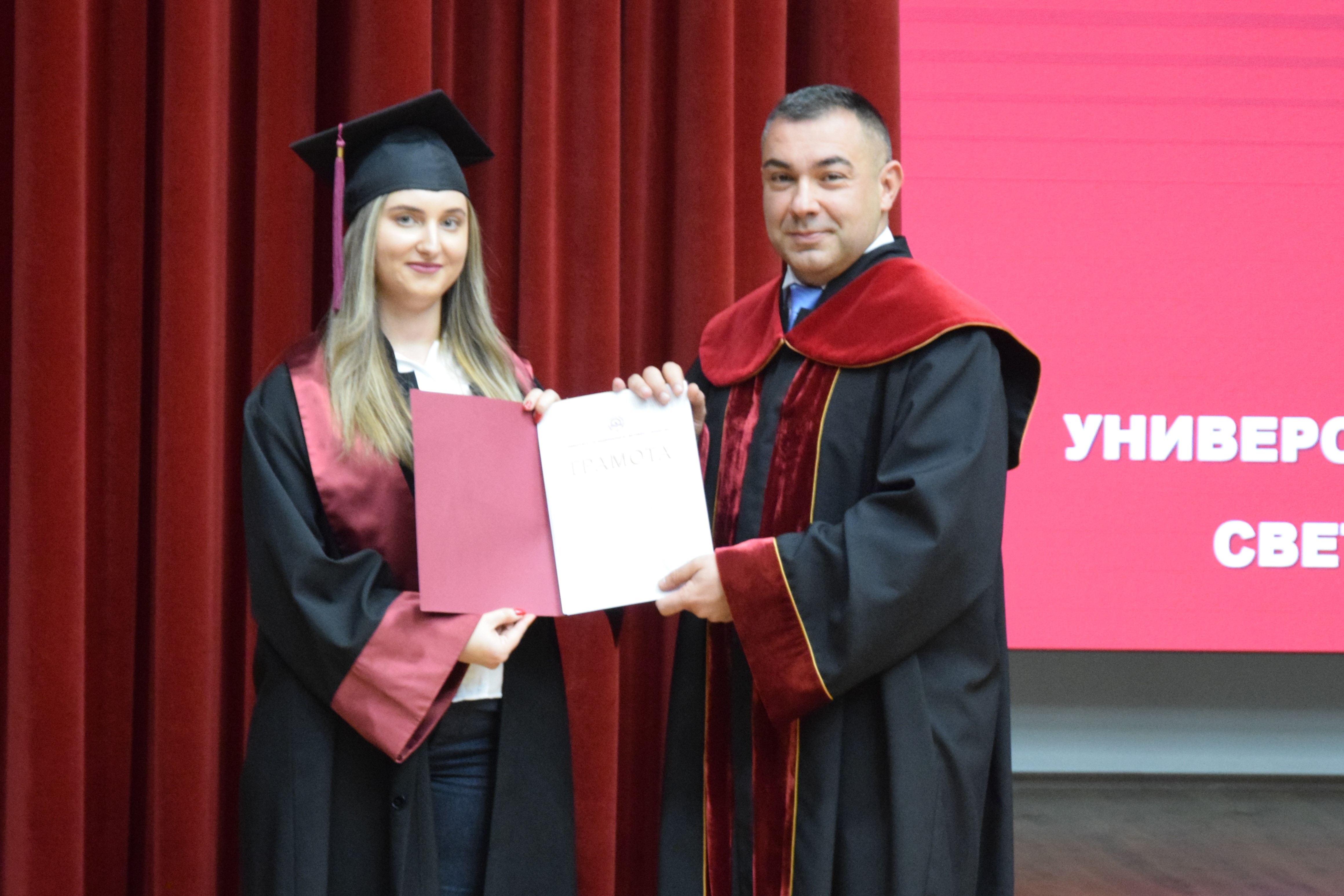 Абсолвентите бяха поздравени и от председателя на Студентския съвет – Калоян Стефанов, който пожела: „Носете в себе си духа на УНСС – дух на професионализъм, почтеност и стремеж към развитие. И нека всяко следващо стъпало бъде ваше собствено доказателство, че сте готови за предизвикателствата на бъдещето“.