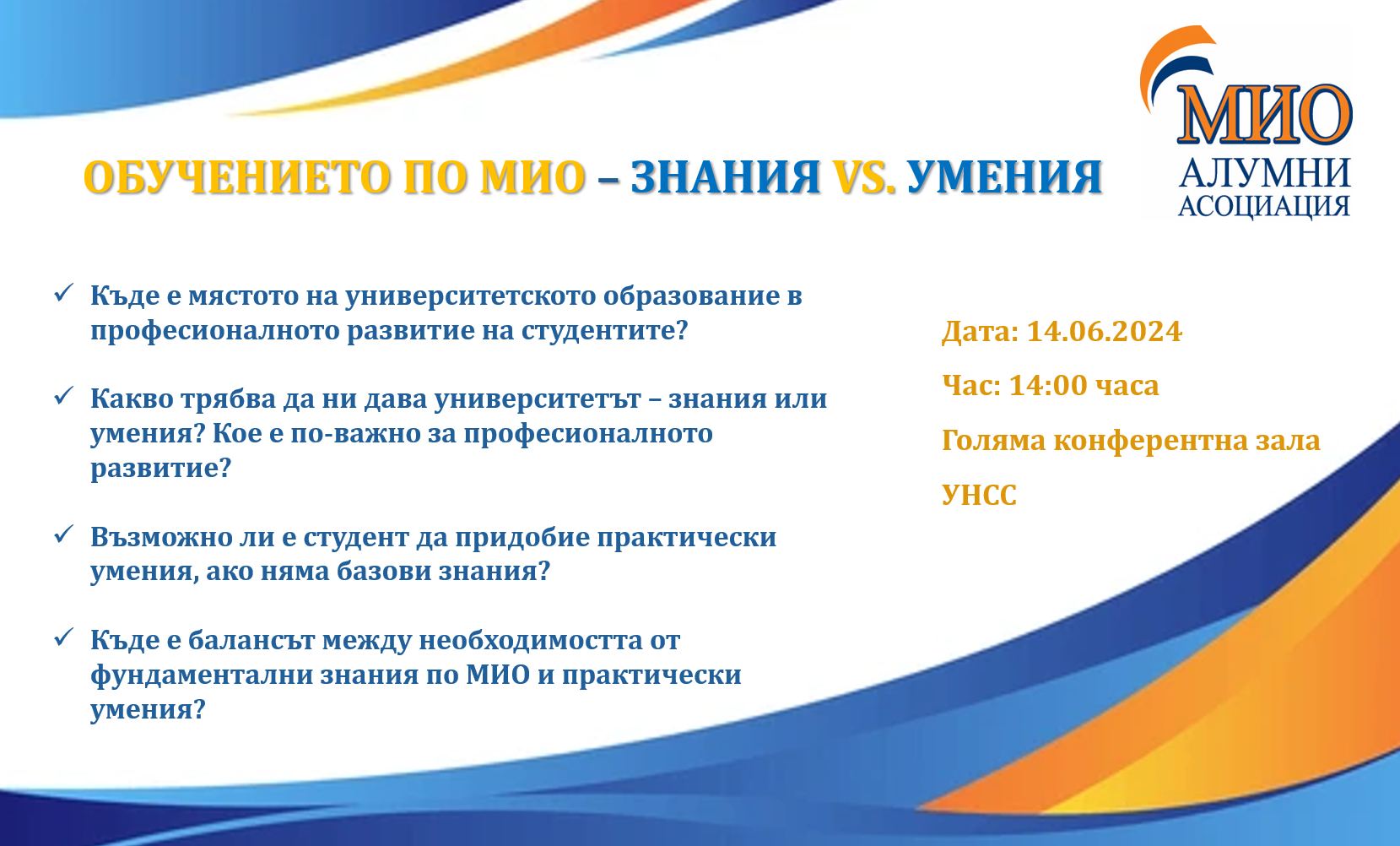 За да продължим да се усъвършенстваме и занапред, на 14 юни катедра "МИО и бизнес" и Алумни асоциацията на завършилите специалност "МИО", УНСС, организират среща-дискусия с бизнеса на тема "Обучението по МИО - знания vs. умения".